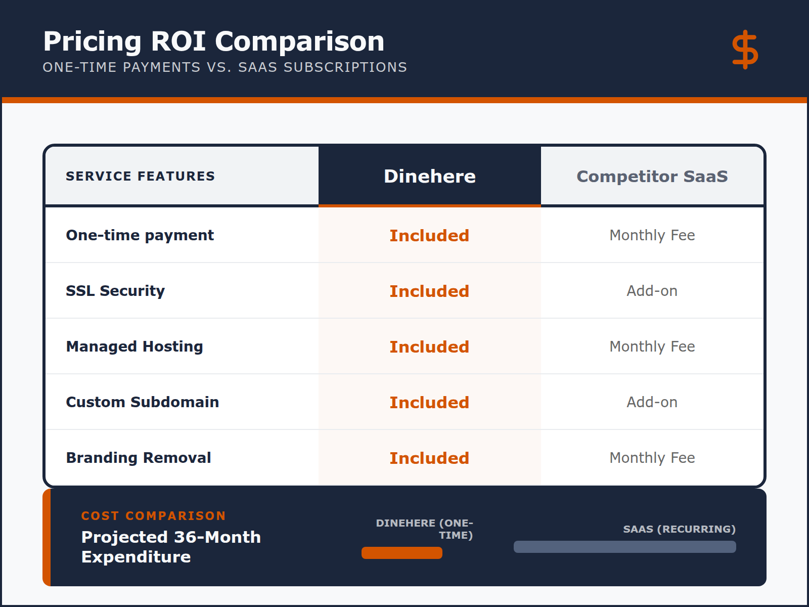 Many general website builders lure you in with a low base price, only to charge extra for SSL security certificates, managed hosting, or removing their own branding. With Dinehere, these essentials are included in the £299 price point. You receive a professional, secure site with a custom subdomain and managed hosting for five years without any surprise bills.